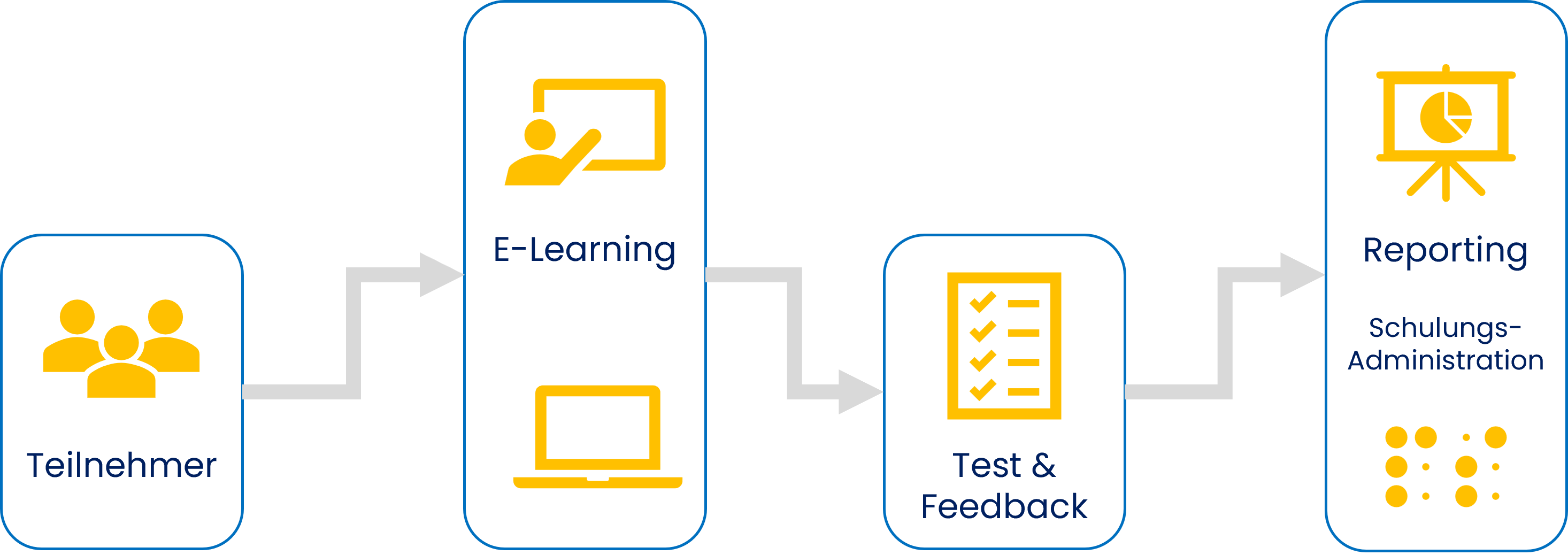 Ein LMS – Learning Management System organisiert und steuert die Fortbildung in Ihrem Unternehmen. Im LMS werden E-Trainings erstellt, Lernziele definiert, Wiederholungszyklen festgelegt und Fragebögen entwickelt.
